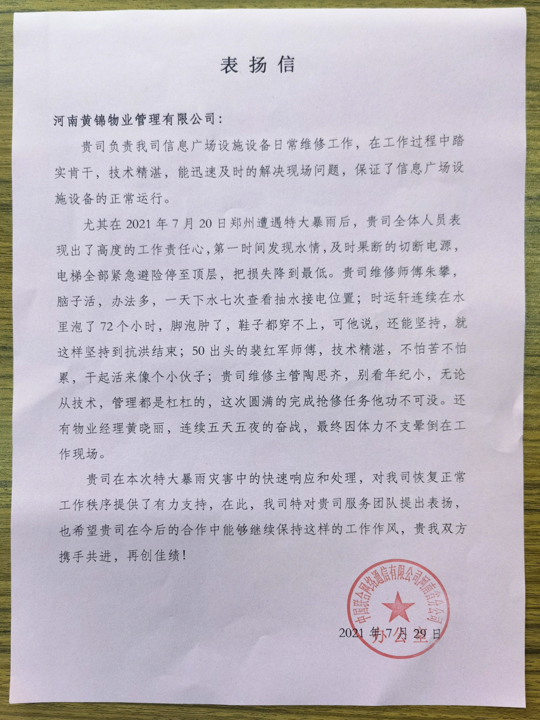 2021年8月6日,黃錦物業(yè)駐國家質(zhì)檢中心項(xiàng)目,收到一封來自河南省產(chǎn)品質(zhì)量安全應(yīng)急服務(wù)中心的表揚(yáng)信,信中對(duì)項(xiàng)目全體員工在暴雨面前臨危不亂,在項(xiàng)目經(jīng)理的帶領(lǐng)下,積極抗洪搶險(xiǎn)工作表示贊揚(yáng)與感謝!
