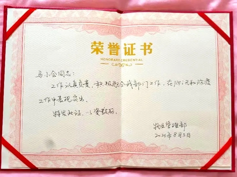 2021年8月3日,機(jī)場(chǎng)貨運(yùn)公司物業(yè)管理部經(jīng)理,親自為黃錦物業(yè)駐機(jī)場(chǎng)貨運(yùn)站項(xiàng)目主管吳瑞紅,保潔班長馬小會(huì)頒發(fā)了榮譽(yù)證書,對(duì)她們?cè)诜姥春头酪吖ぷ髦?,認(rèn)真負(fù)責(zé)、積極配合的表現(xiàn)給予高度贊揚(yáng)。