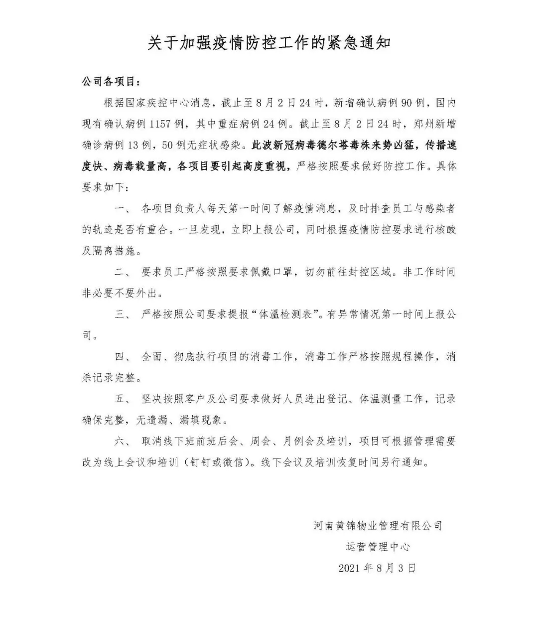 面對(duì)形勢(shì)嚴(yán)峻的疫情反彈,黃錦物業(yè)公司領(lǐng)導(dǎo)高度重視,及時(shí)下發(fā)疫情防控緊急通知文件。