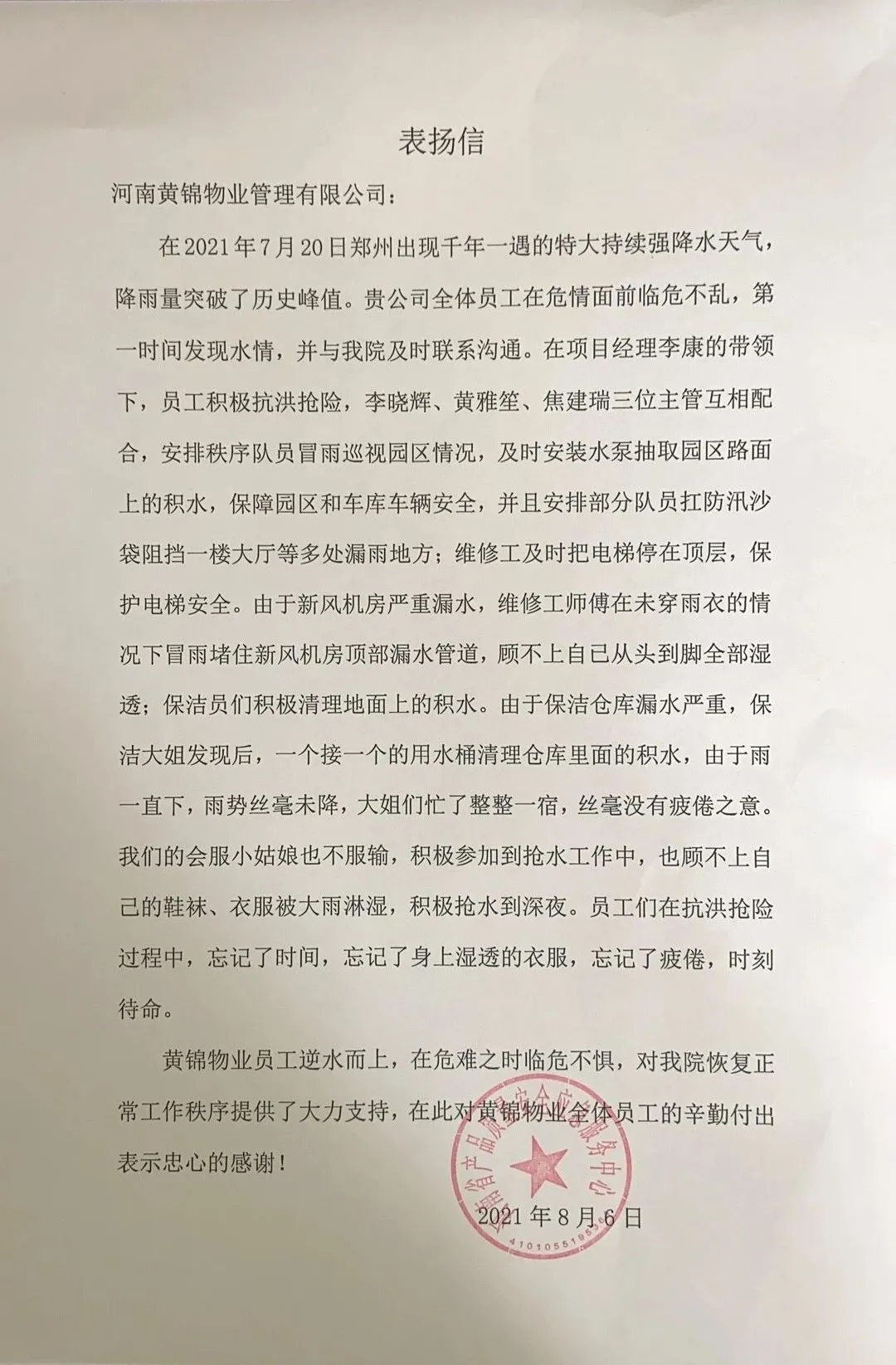 2021年8月6日,黃錦物業(yè)駐國家質(zhì)檢中心項(xiàng)目,收到一封來自河南省產(chǎn)品質(zhì)量安全應(yīng)急服務(wù)中心的表揚(yáng)信,信中對(duì)項(xiàng)目全體員工在暴雨面前臨危不亂,在項(xiàng)目經(jīng)理的帶領(lǐng)下,積極抗洪搶險(xiǎn)工作表示贊揚(yáng)與感謝!
