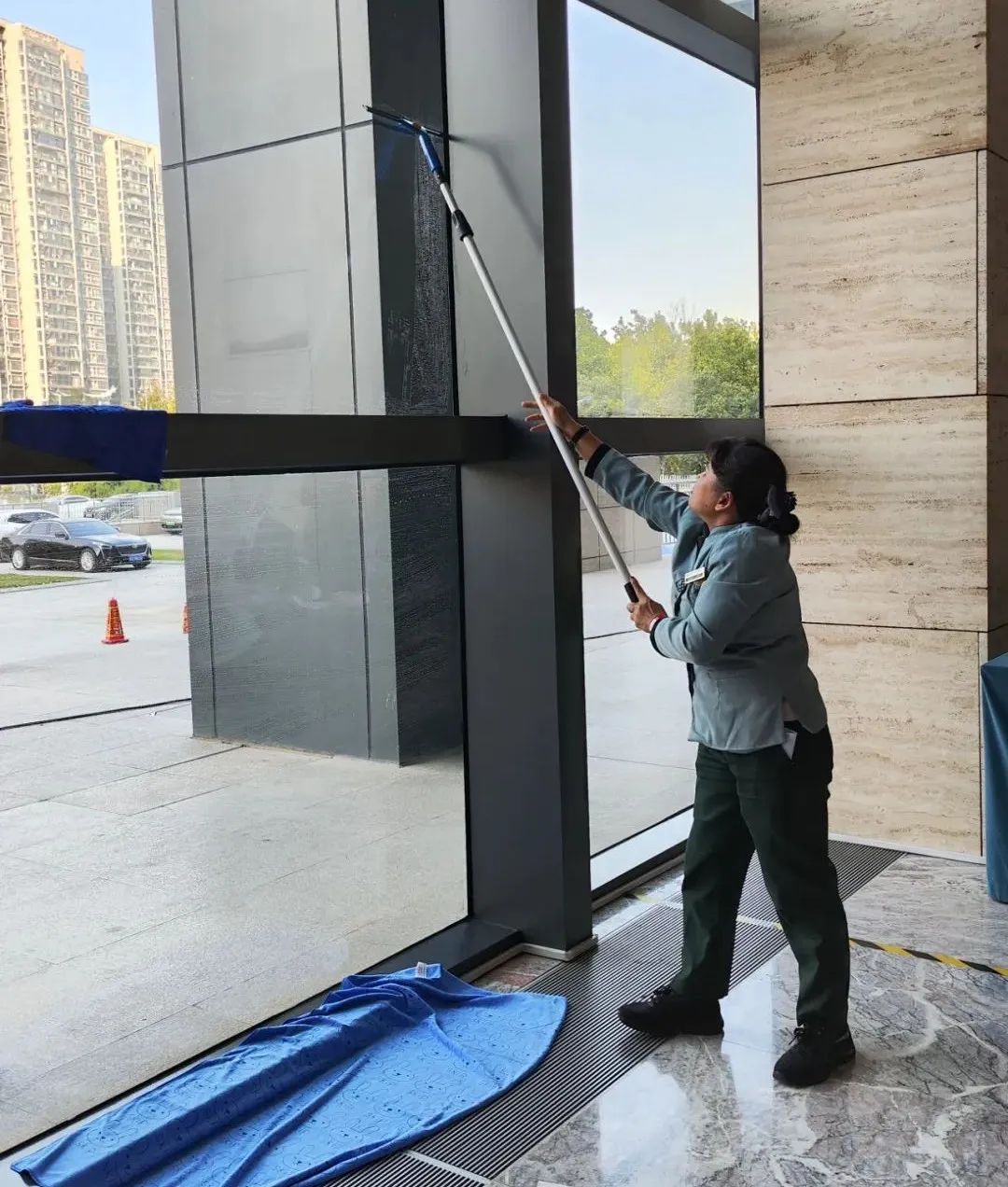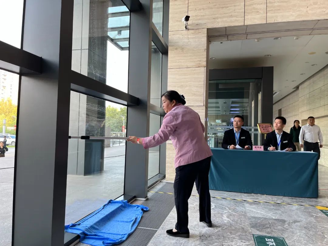 來到“玻璃刮拭”賽區(qū),在參賽選手準確配比清潔溶液,迅速有章的涂抹、刮拭等一套專業(yè)技操之后,一塊干凈明亮的玻璃展示在我們面前。